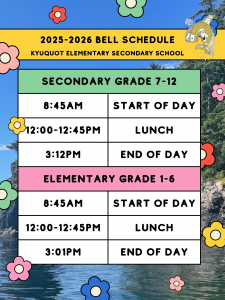 Kyuquot Elementary Secondary School is grateful to be able to provide a full meal program to all of our students each day.